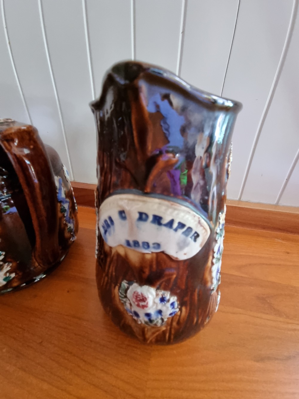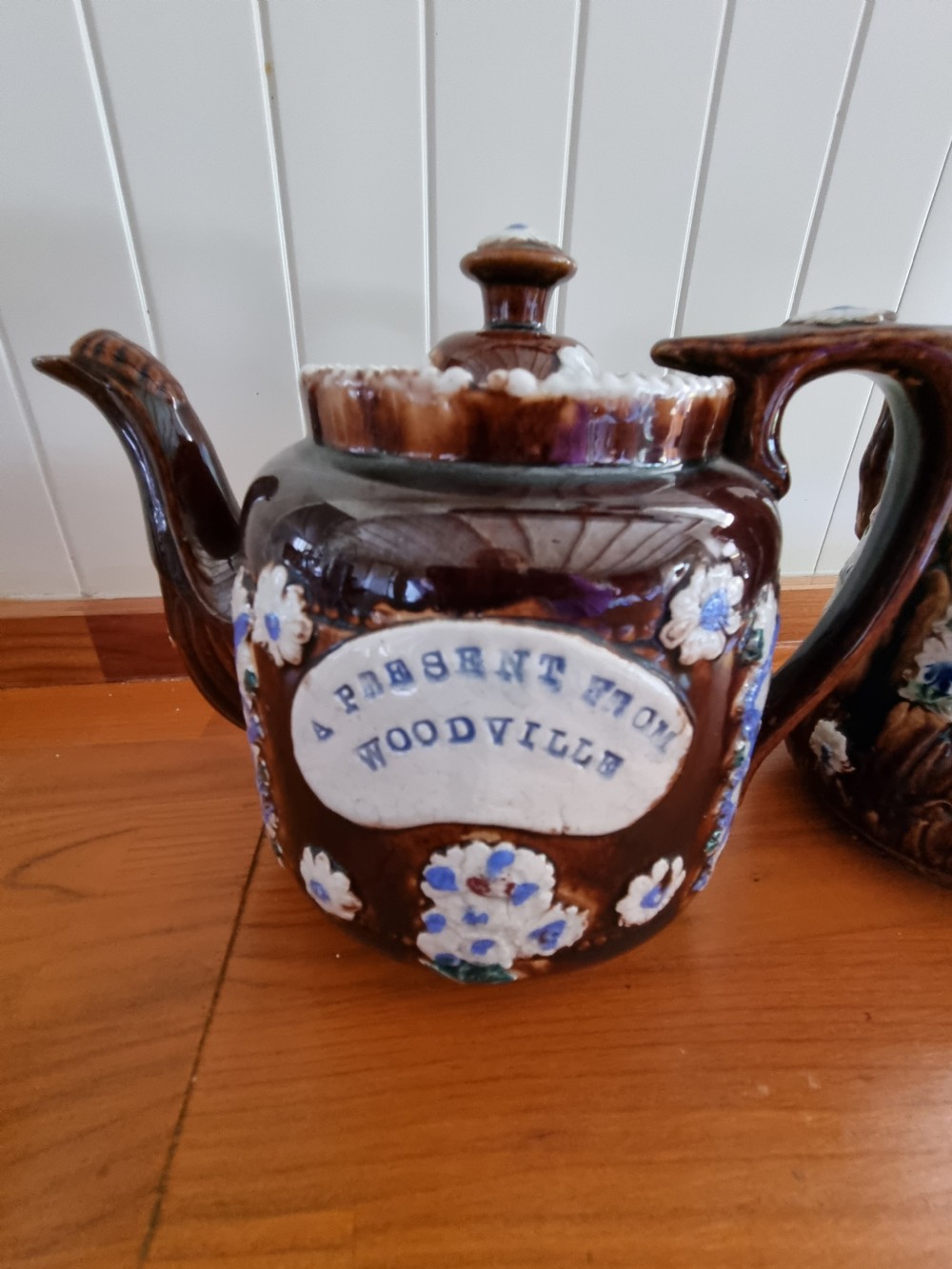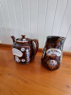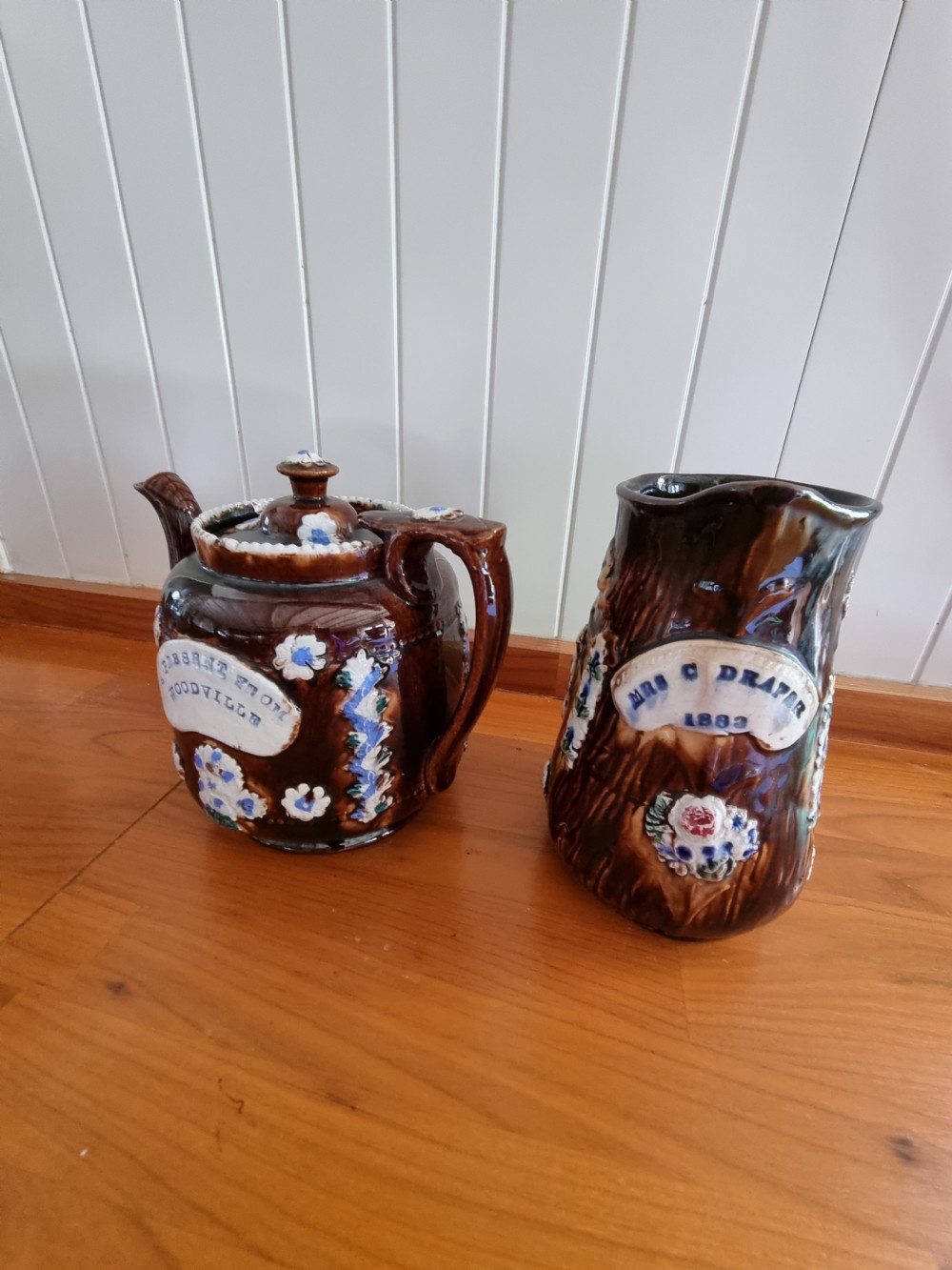 2 19THC PIECES OF GENUINE POTTERY BARGEWARE .ONE DATED 1883 MRS C DRAPER ( JUG) AND THE TEAPOT " A PRESENT FROM WOODVILLE"