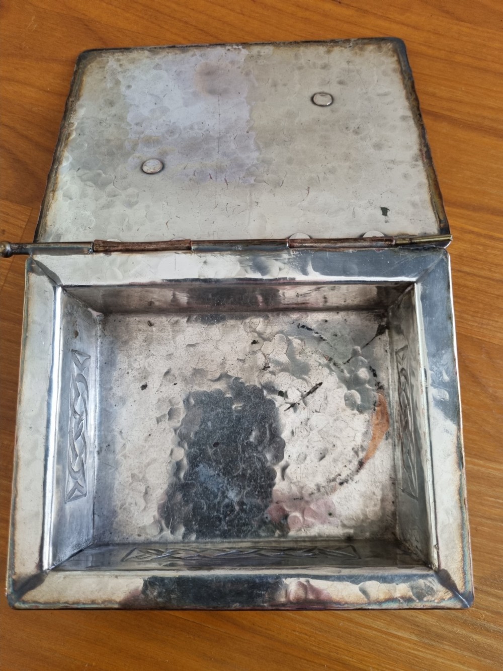 CHECK OUT THE OFFSET HINGES, THE CELTIC KNOTS , FRONT AND SIDES ,THE HAND BEATEN SURFACES ETC