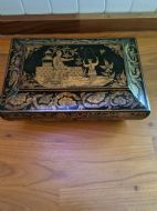 IT DATES AROUND 1780 AND HAS ORIENTAL SCENES ON THE LID AND SIDES.