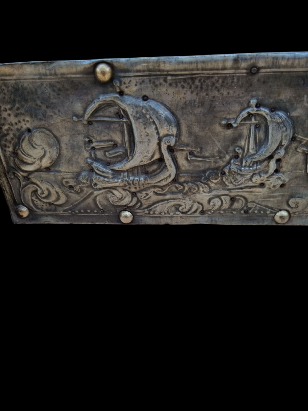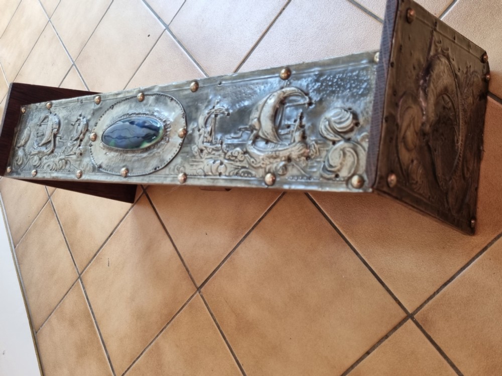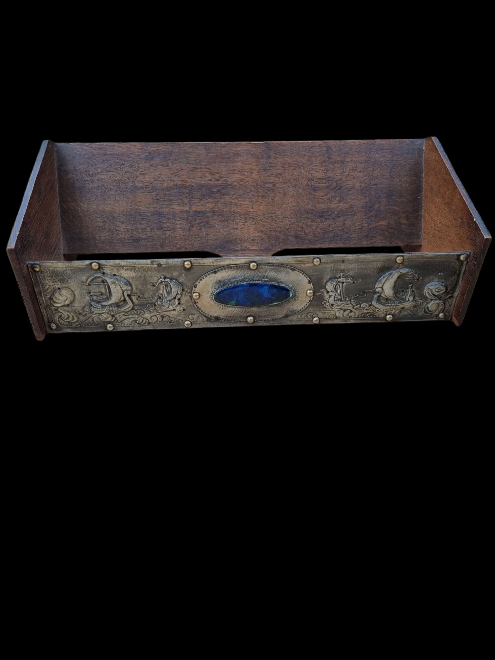 FROM A RECENT HOUSE CALL THE MOST COMPLETE AND PATINATED PIECE OF ARTS AND CRAFTS WE HAVE EVER BOUGHT. WE CANNOT BELIEVE THE PATINATION ON THE BRASS SHEET WHICH HAS ADOPTED THE COLOUR OF MELLOW PEWTER. FABULOUS. IT IS LAID ON OAK WHICH.ALL INDICATORS POINT TO IT BEING AN IMPORTANT.PIECE OF BIRMINGHAM SCHOOL OF ARTS AND HANDICRAFTS C1900 IT MEASURES 52CMS L 23CMS D AND 17CMS H ABSOLUTELY MINT . WHO EVER BUYS THIS PIECE WILL HAVE A MUSEUM QUALITY PIECE.OF ARTS AND CRAFTS. THE SUBJECT MATTER IS SAILING SHIPS ON STORMY SEAS. UK POSTAGE INCLUDED ALL.FORMS OF PAYMENT INCLUDING CCS ETC LAPADA_CINOA MEMBERS SINCE1985 ESTABLISHED IN1977 IN CHESTER ALL CREDIT CARDS AND PAYPAL ACCEPTED ALL ITEMS BACKED BY LAPADA GUARANTEE ALL CONSUMER RIGHTS OBSERVED