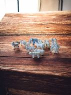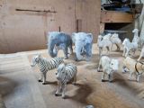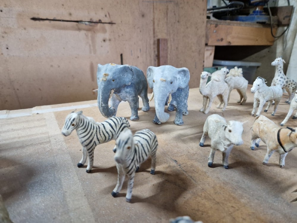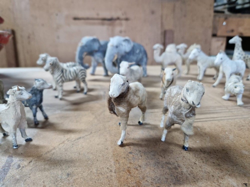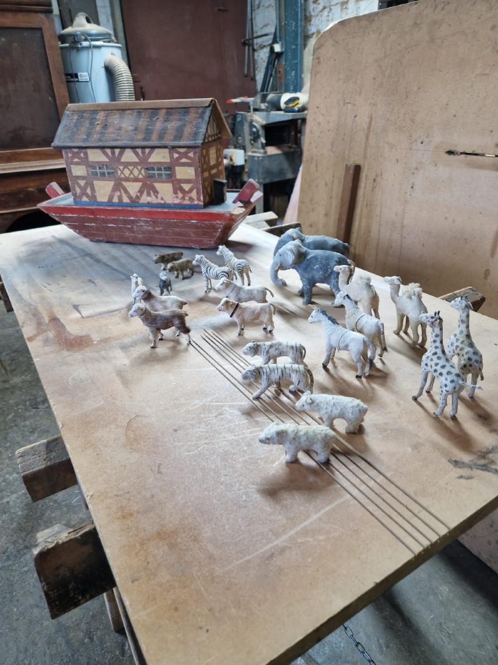 A RARE CHANCE TO.ACQUIRE A GENUINE VICTORIAN NOAH,S ARK IN ORIGINAL CONDITION INCLUDING METAL WHEELS AND 11 PAIRS OF HIDE COVERED WOODEN ANIMALS INCLUDING ELEPHANTS, GOATS, HORSES, ZEBRAS ETC ETC. MEASURING FROM 11CMS H TO 6CMS .ALL IN PLAY WORN BUT GOOD CONDITION.