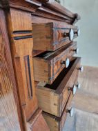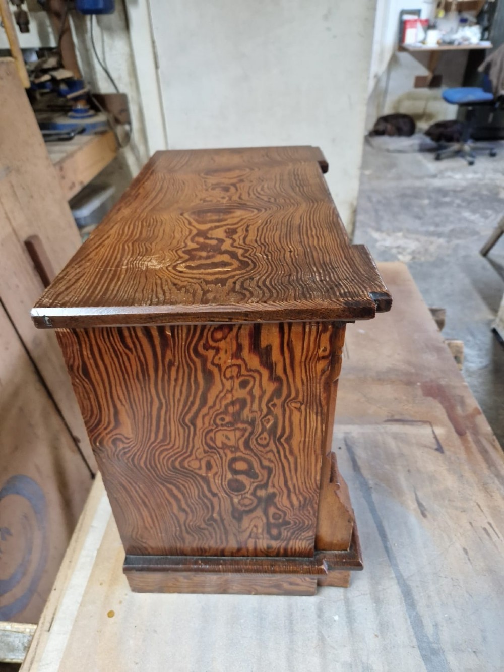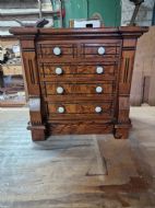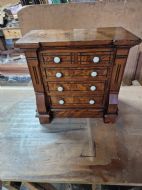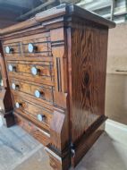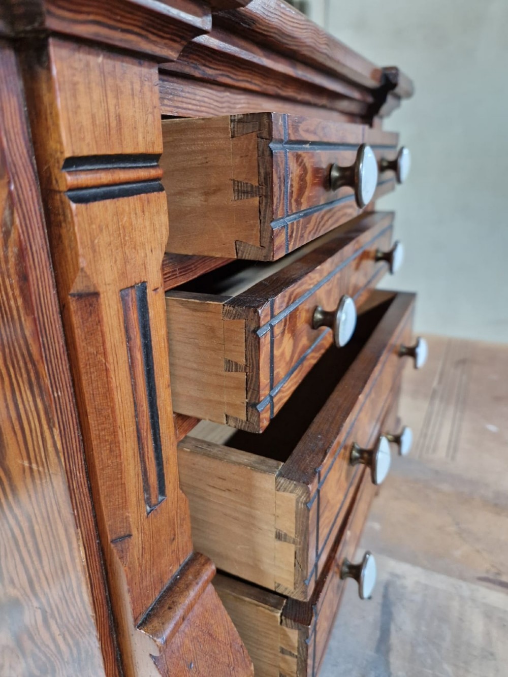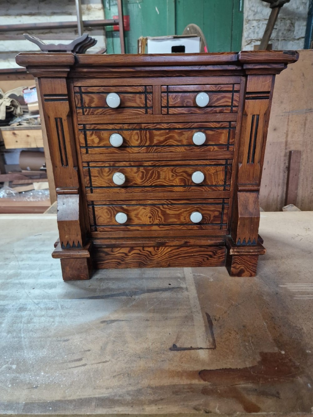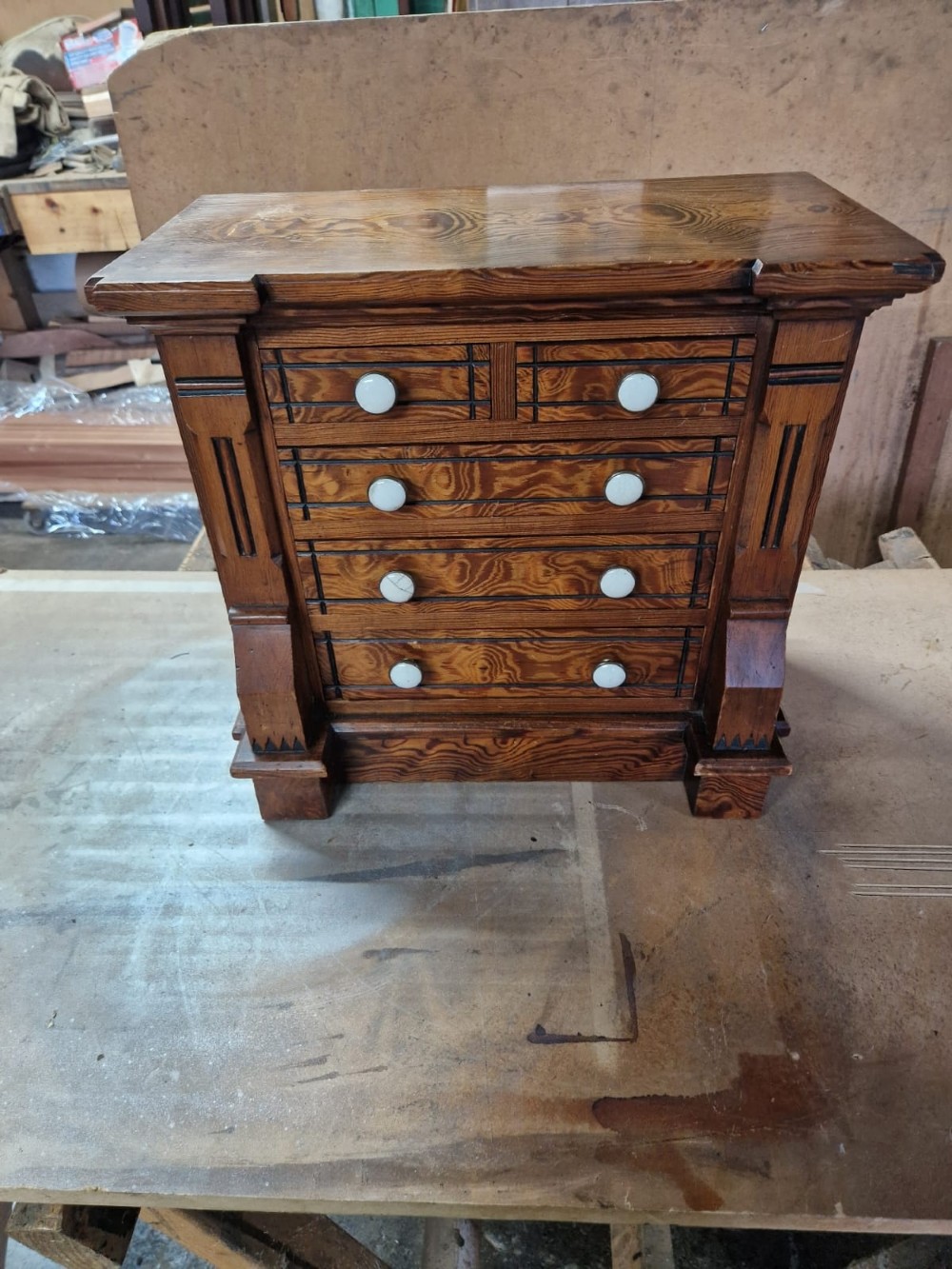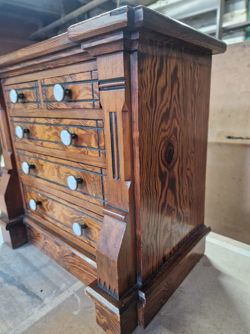 DO THEY COME MUCH BETTER? A SUPER 19THC SUPERBLY FIGURED SOLID PITCH PINE MINATURE CHEST OF DRAWERS IN COMPLETELY ORIGINAL CONDITION. IF THIS WAS AN APPRENTICE PIECE THEN HE MUST OF COME TOP OF THE CLASS @! MORE LIKELY TO HAVE BEEN MADE ON A COMMISSION. IT IS IN THE AESTHETIC STYLE DATING AROUND 1880 .COMPLETE WITH LINE INLAY ,ORIGINAL CHINA KNOBS AND MADE TO THE HIGHEST QUALITY IT MEASURES 42cms H 32cms W 18cms Deep A CLASSIC PIECE AND SUITABLE FOR MANY USES AS WELL AS LOOKING BEAUTIFUL. UK DELIVERY INCLUDED ALL FORMS OF PAYMENT INCLUDING CCS ETC LAPADA_CINOA MEMBERS SINCE1985 ESTABLISHED IN1977 IN CHESTER ALL CREDIT CARDS AND PAYPAL ACCEPTED ALL ITEMS BACKED BY LAPADA GUARANTEE ALL CONSUMER RIGHTS OBSERVED
