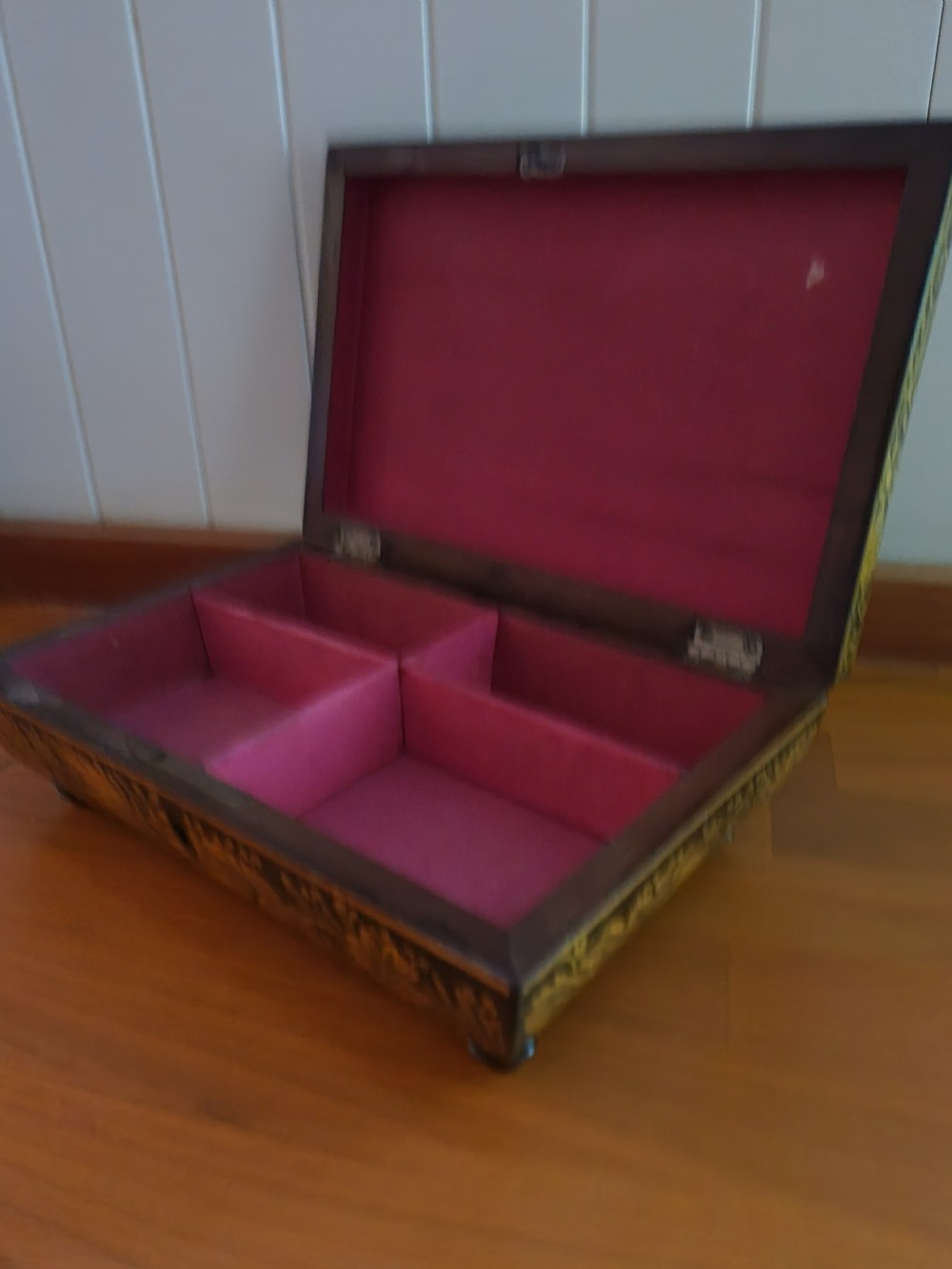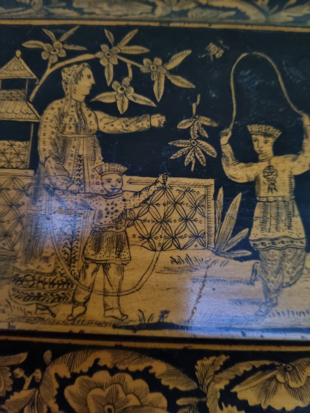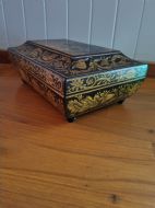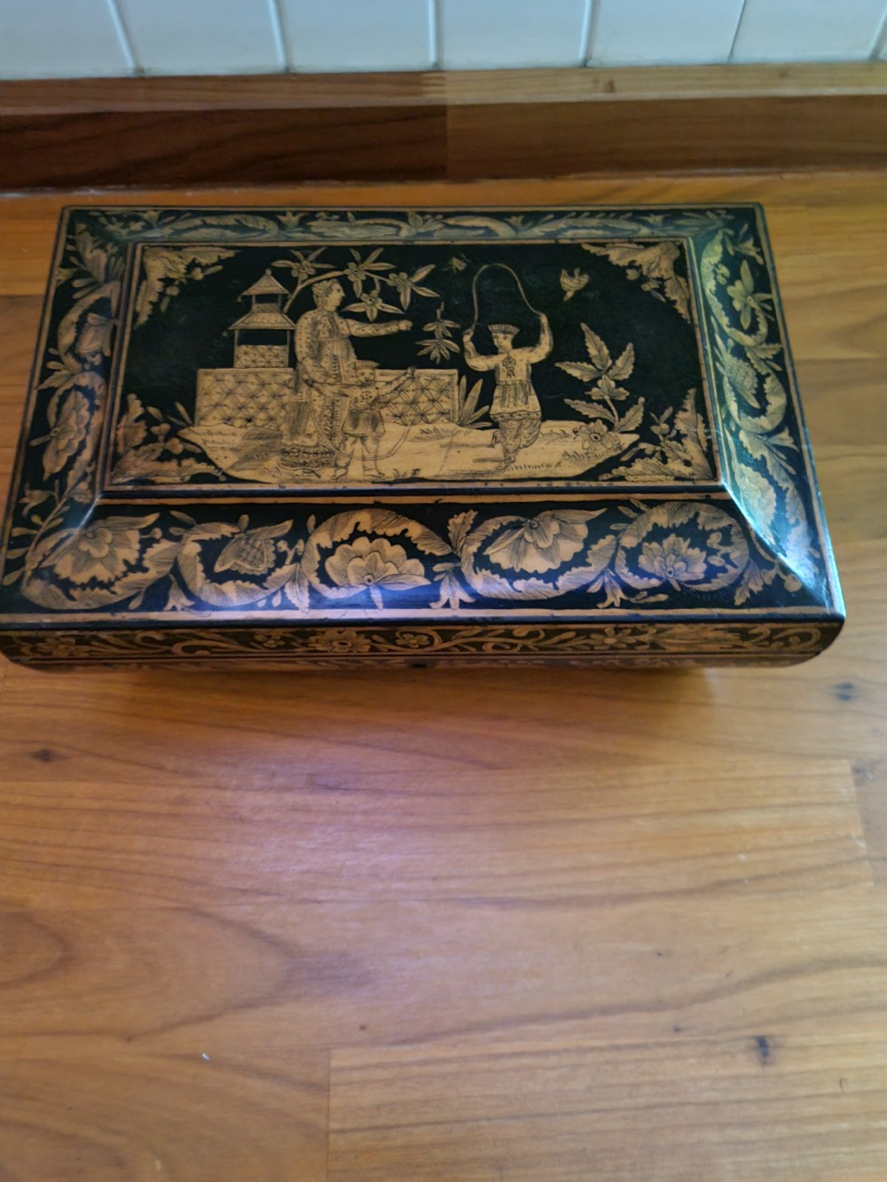 IT DATES AROUND 1780 AND HAS ORIENTAL SCENES ON THE LID AND SIDES.