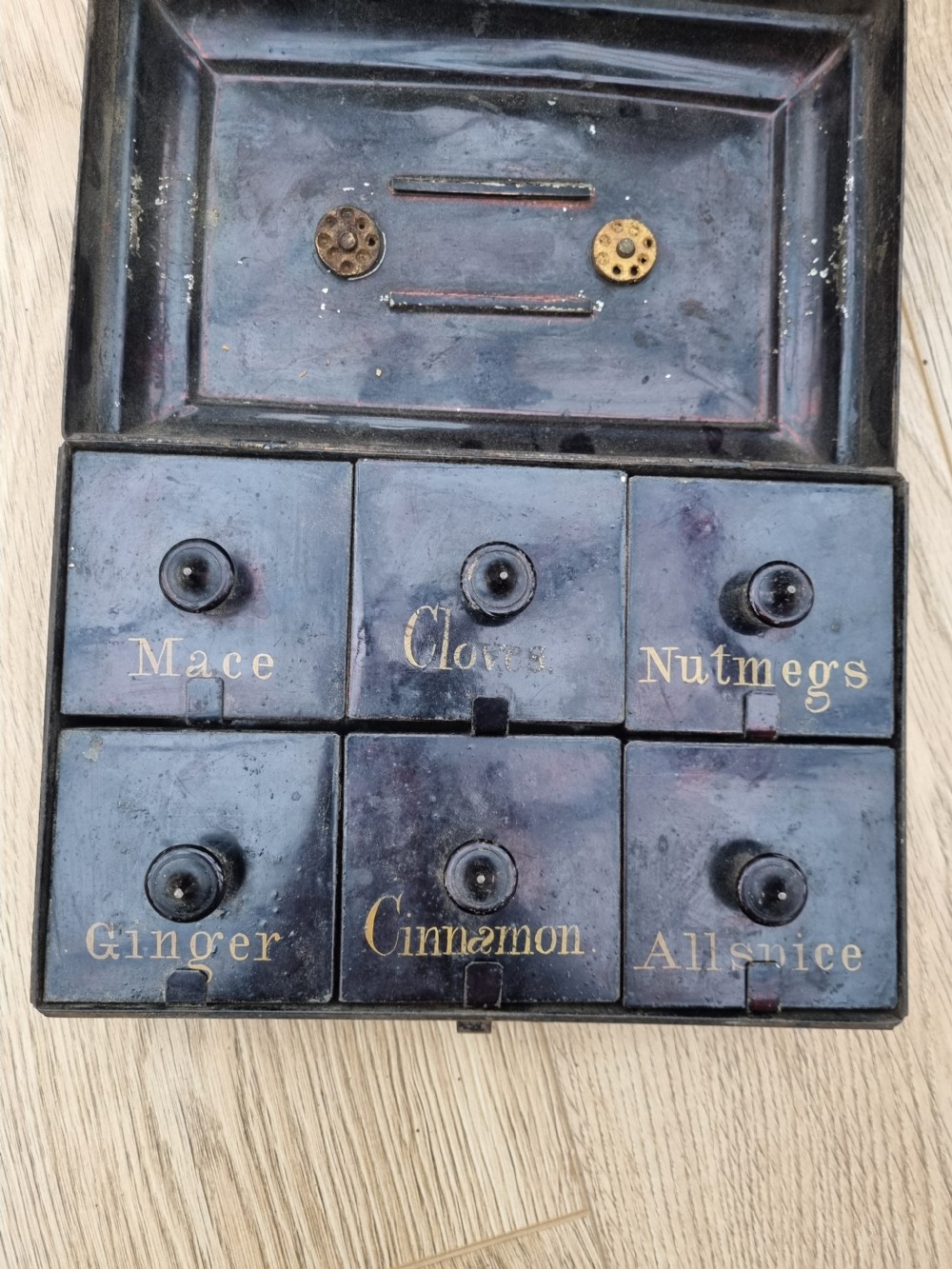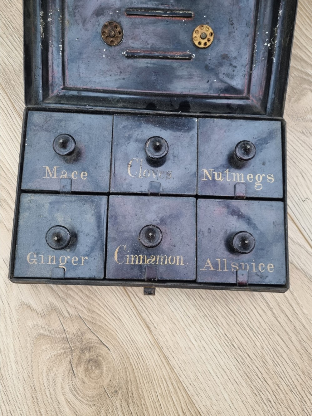 FROM A GENUINE YORKSHIRE COUNTRY HOUSE KITCHEN UNTOUCHED FOR OVER 80 YEARS A 19THC TIN.SPICE BOX COMPLETE WITH ORIGINAL CONTENTS c1880 IT MEASURES 24CMS L, D16CMS, H10CMS . WELL USED AND WITH THE ODD DENT BUT STRUCTURALLY SOUND. NO REPAIRS ETC A GREAT PIECE OF KITCHENALIA AND AS ALWAYS REALISTICALLY PRICED. UK POSTAGE INCLUDED ALL FORMS OF PAYMENT INCLUDING CCS ETC LAPADA_CINOA MEMBERS SINCE1985 ESTABLISHED IN1977 IN CHESTER ALL CREDIT CARDS AND PAYPAL ACCEPTED ALL ITEMS BACKED BY LAPADA GUARANTEE ALL CONSUMER RIGHTS OBSERVED