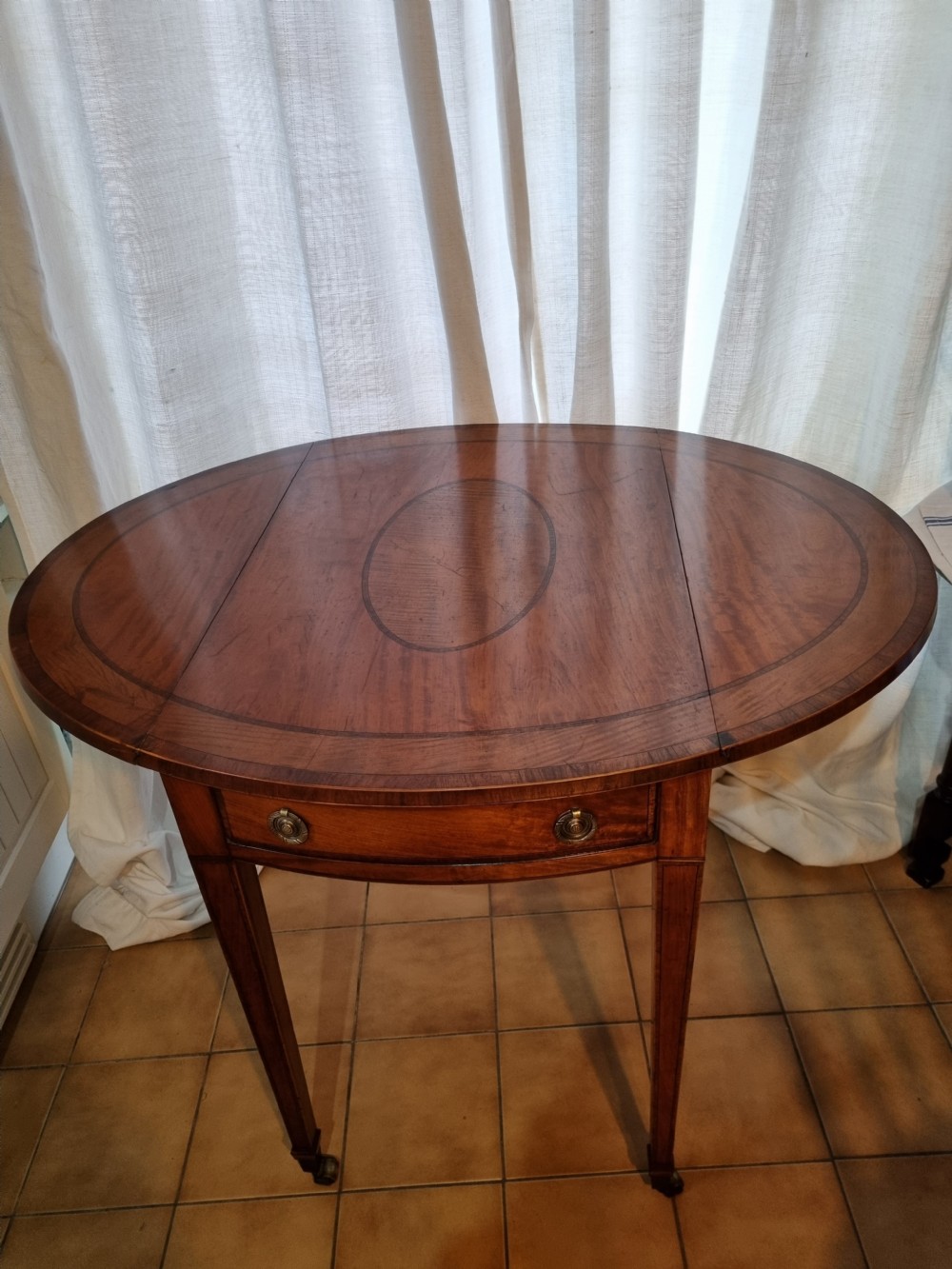 A QUALITY GEORGIAN INLAID SATINWOOD DROP FLAP TABLE ,C1810 IN FABULOUS UNTOUCHED PERFECT CONDITION. SATINWOOD FROM THE WEST INDIES IS THE MAIN WOOD AND IT IS BEAUTIFULLY BANDED IN ROSEWOOD ALSO FROM THE WEST INDIES. THE OVAL INLAID PANEL ON THE TOP IS A LIGHTER SATINWOOD SPECIMEN. ALL SIGNS OF A TOP CLASS LONDON MAKER. THE HANDLES AND CASTORS ARE ORIGINAL ,THE HANDLES RETAINING THEIR ORIGINAL GILT. IT MEASURES CLOSED 75CMS LONG AND 45CMS WIDE. IDEAL FOR AN END TABLE OR FOR MANY AREAS OF THE HOME. 96CMS WIDE OPEN. A REAL " CITY " PIECE AND AS ALWAYS OFFERED AT OUR NORMAL REALISTIC PRICE UK DELIVERY INCLUDED ALL FORMS OF PAYMENT INC CCS ETC LAPADA_CINOA MEMBERS SINCE1985 ESTABLISHED IN1977 IN CHESTER ALL CREDIT CARDS AND PAYPAL ACCEPTED ALL ITEMS BACKED BY LAPADA GUARANTEE ALL CONSUMER RIGHTS OBSERVED