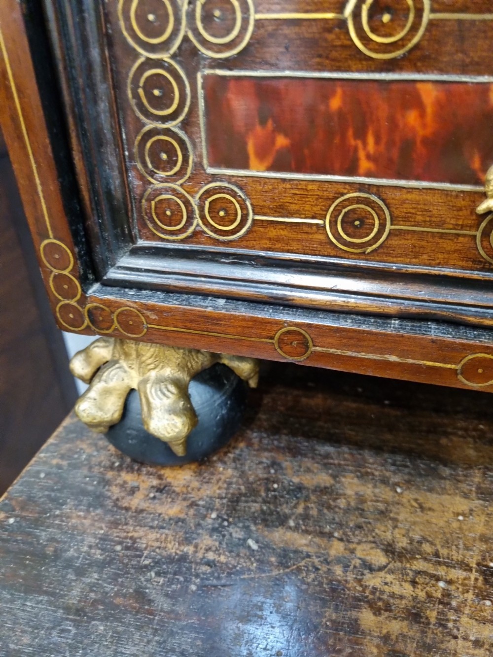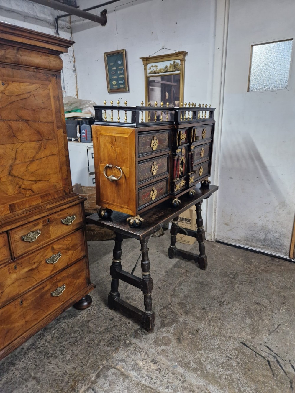 THIS COMPLETELY ORIGINAL LATE 17THC SPANISH RED TORTOISESHELL CABINET ON ORIGINAL WALNUT STAND. THE EX PROPERTY OF AN AUSTRIAN NOBLELADY AND DATING AROUND 1680. THE PICTURES TELL THE STORY. ORIGINALLY FOUND IN SPANISH HIGH SOCIETY HOMES AS A PIECE OF FURNITURE OF HIGH IMPORTANCE. IT EVEN HAS A 19THC PAPER LABEL UNDER THE TABLE SIMPLY STATING " MADRID" THE GILT METAL AND GILTWOOD FIXTURES ARE ALL ORIGINAL AND PERFECT A VERY RARE PIECE SUITABLE FOR MANY AREAS IN THE HOME. IT MEASURES I06cms WIDE 28cms DEEP 68cms h The table 112cms W cms 42cms D 75cms H UK DELIVERY INCLUDED ALL FORMS OF PAYMENT INCLUDING CCS ETC LAPADA_CINOA MEMBERS SINCE1985 ESTABLISHED IN1977 IN CHESTER ALL CREDIT CARDS AND PAYPAL ACCEPTED ALL ITEMS BACKED BY LAPADA GUARANTEE ALL CONSUMER RIGHTS OBSERVED
