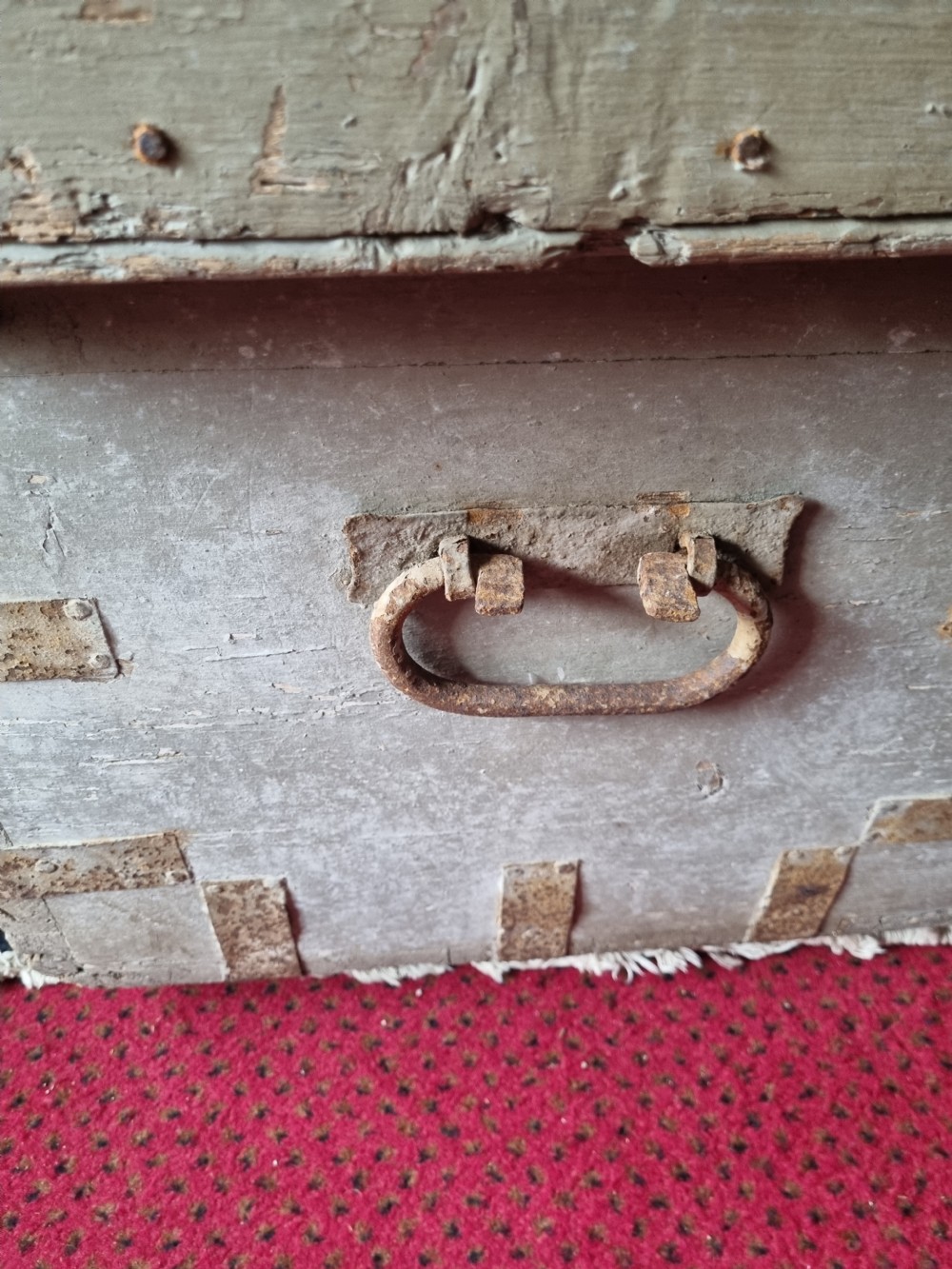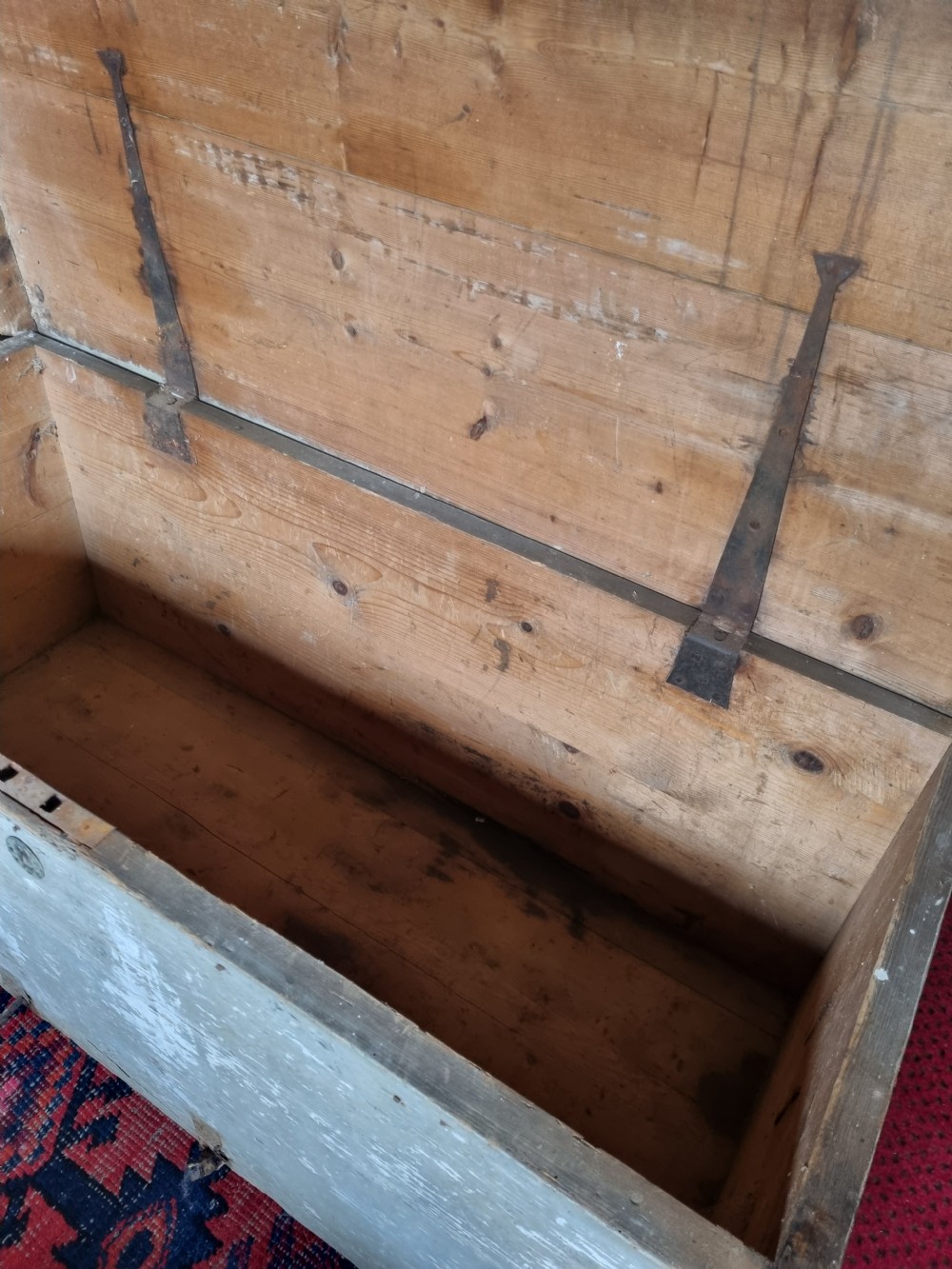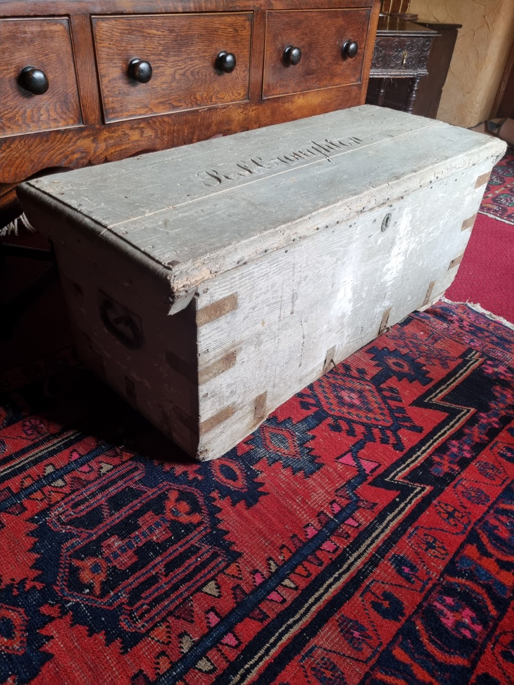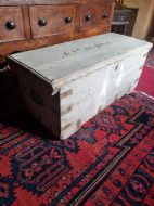 A 124CMS L 19THC ORIGINAL PAINTED PINE CHEST . POSSIBLY A SEAMAN,S CHEST WITH NAME CARVED ON THE LID. WE ARE DATING IT AS AROUND 1830 BUT COULD BE EARLIER. ALL THE METALWORK IS ORIGINAL AND NO REPAIRS OR REPLACEMENTS . READY TO BE REPURPOSED AS A LARGE COFFEE TABLE. CHILD,S TOY STORE OR ANYTHING IN BETWEEN. THE MEASUREMENTS ARE 124CMS L 53CMS H AND 52CMS D UK DELIVERY INCLUDED ALL FORMS OF PAYMENT INCLUDING CCS ETC LAPADA_CINOA MEMBERS SINCE1985 ESTABLISHED IN CHESTER IN 1977 ALL CREDIT CARDS AND PAYPAL ACCEPTED ALL ITEMS BACKED BY LAPADA GUARANTEE ALL CONSUMER RIGHTS OBSERVED